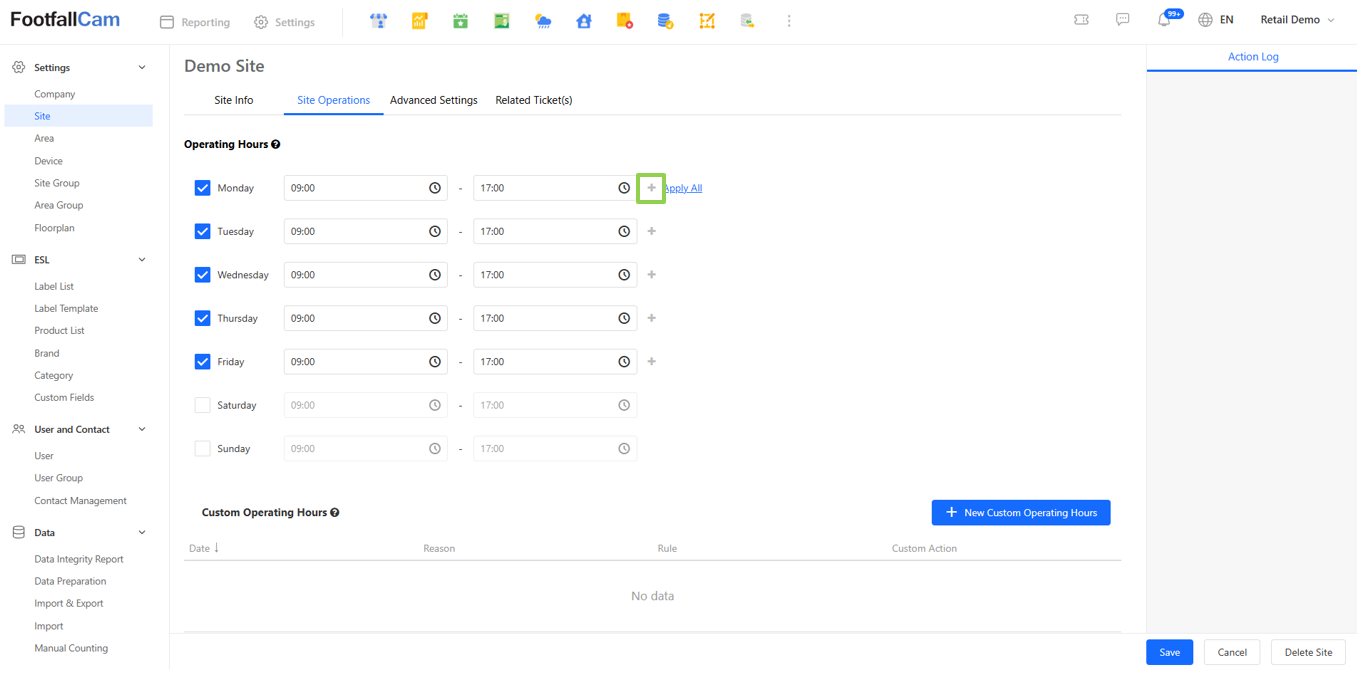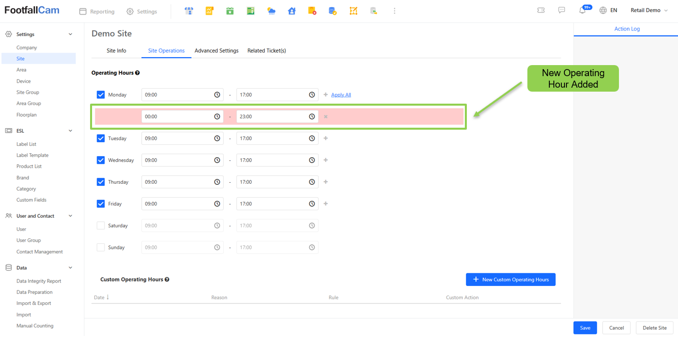 Custom Operating Hours are extraordinary configurations of operating hours for a particular date (range). The configuration must be set up 24 hours before the date (range) applied for the setting to take effect. If the custom operating hours for a site are not set despite the site operating beyond the normal operating hours, any detected activity beyond the normal operating hours will be classified as "abnormal data", affecting the accuracy of future calculations and presentations.