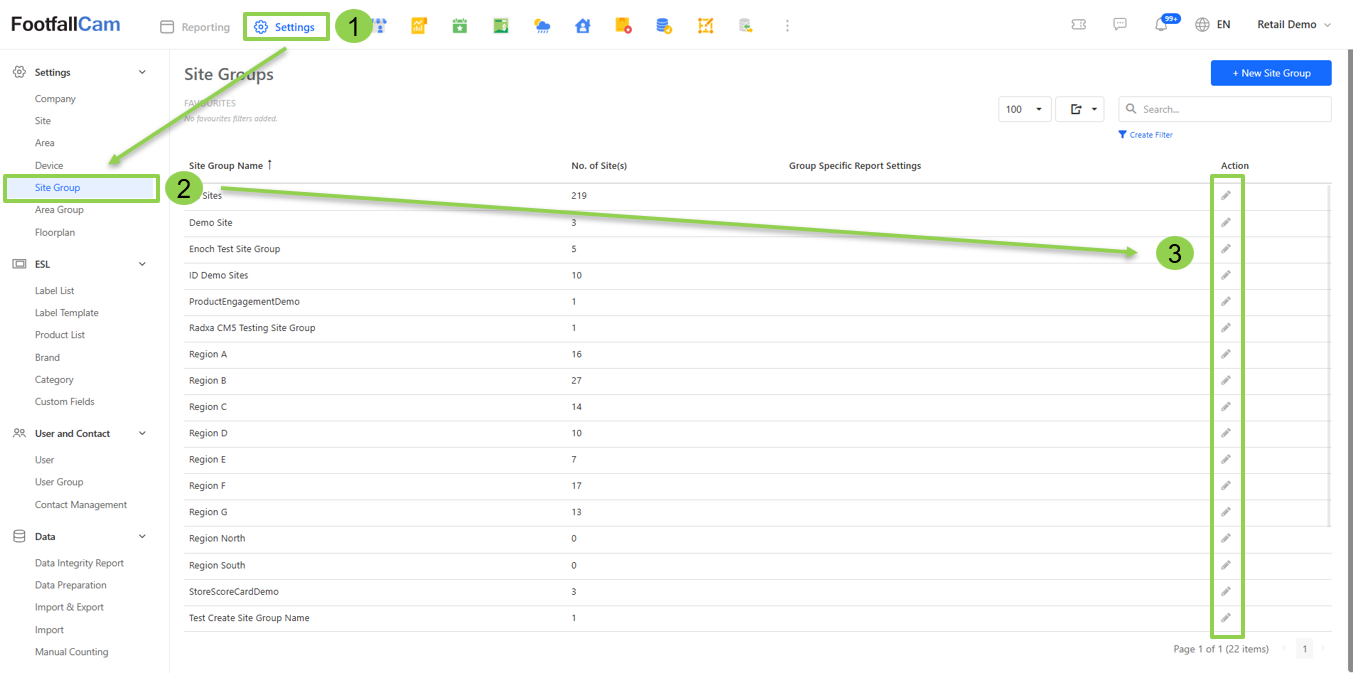 Step 1 - Click on Settings > Site > Edit button in Action column to access the specific Site page.
