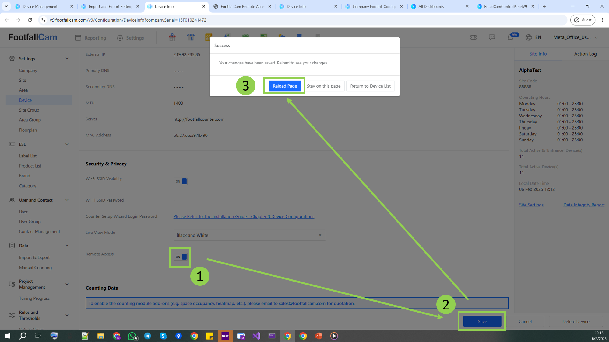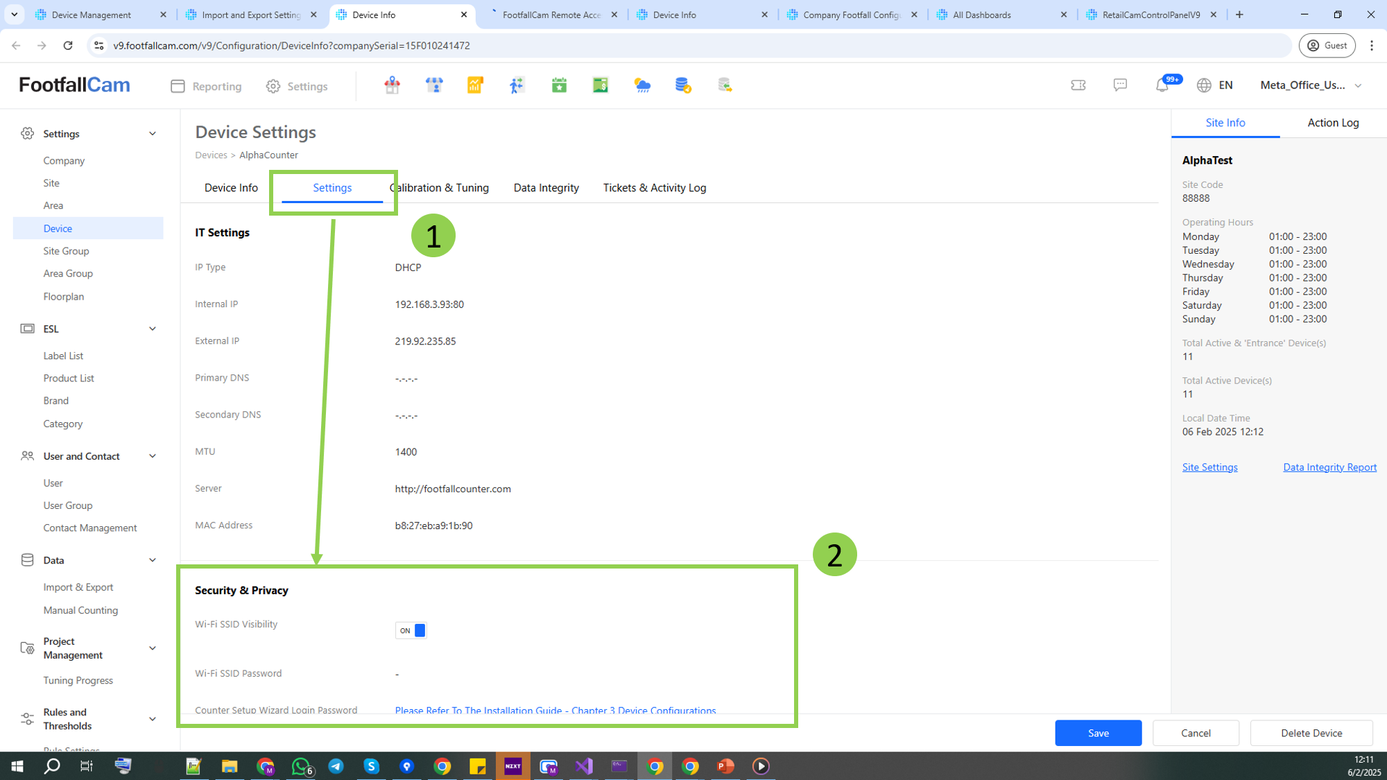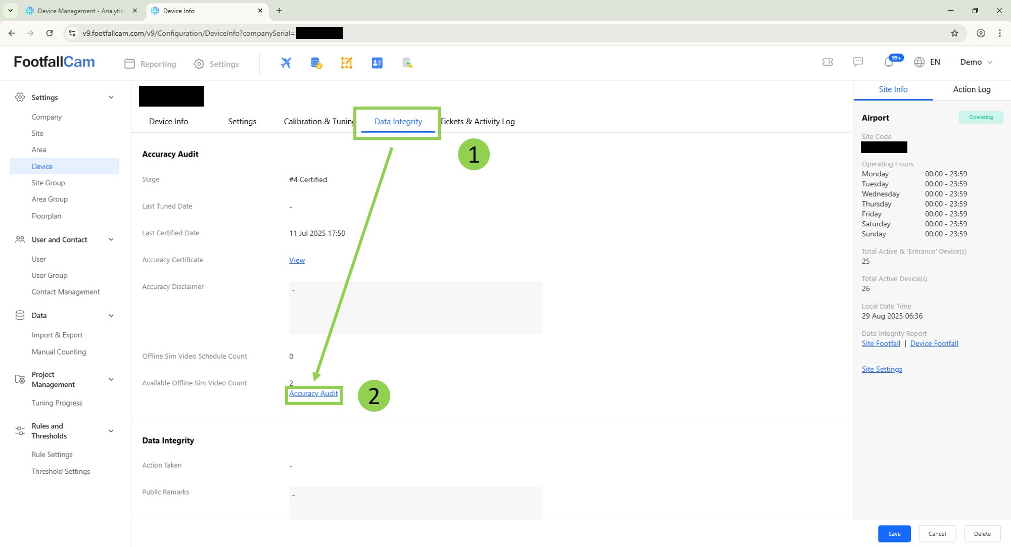 | Pre-Requisites | 1. Check the Device(s) status to ensure it is active, enabled with the 'Footfall Counting' and 'Site Entrance' counting usage and is currently Online 2. Check the device accuracy audit stage to ensure it is tuned or certified * Repeat Step 1 and 2 for all the device(s) of the site which is intended to collect site level footfall data |