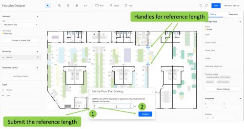 Step 3 - Set a reference length with any two points on the floor plan. Insert the actual distance (in meters) between these two points and click "Confirm".