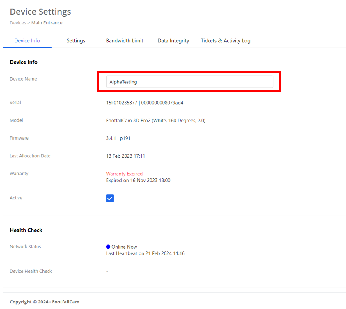 The Device Setting page allows the user to view/configure the following aspects of a device. The following are some actions that the user can perform on this page: