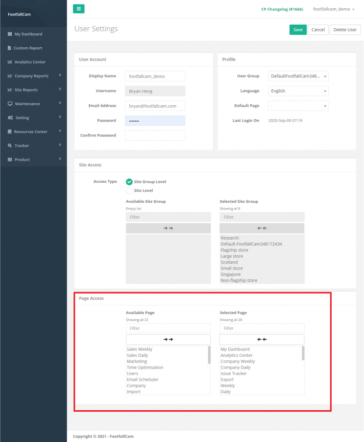 Admin user for FootfallCam Analytic Manager V9™ can alters the reports access to enable certain user to view and hide from other user. This section focuses on the configuration of report page access.