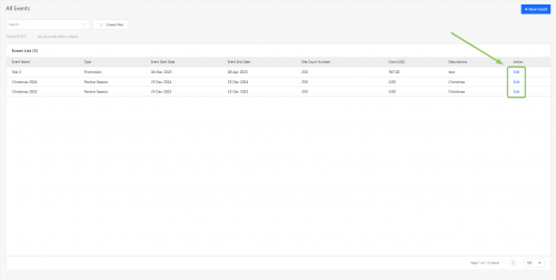 This page displays all existing events and allows users to create new events or edit current ones. It also includes filtering options to help locate specific events more easily.