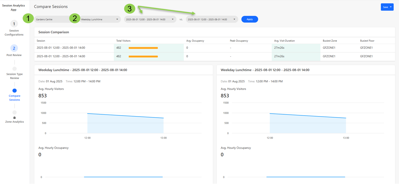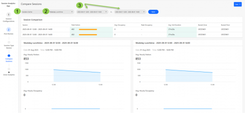 Users can select 2 different session instances from the selected sessions to compare their data. A session instance refers to the same type of session occurring on different dates - for example, comparing the Lunch Time session from this week with the Lunch Time session from last week. |