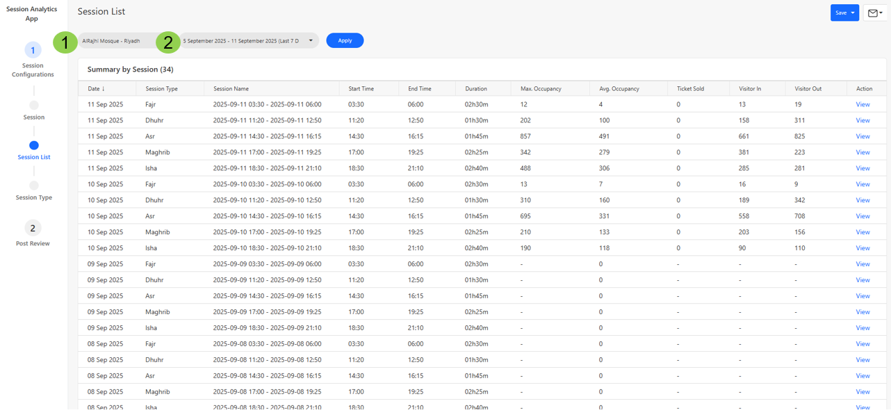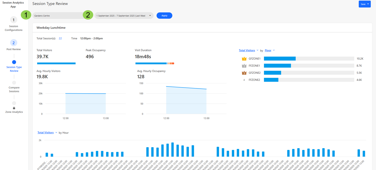 Session Type Review allows users to choose a specific Site and apply a date range filter to see all sessions that were created for that Site within the selected date range. Within this dashboard, the filtered sessions are presented along with interactive analytic charts, giving users a clear visual overview of session trends and performance. These insights help users analyze patterns, compare results, and apply the findings to support their business decisions.